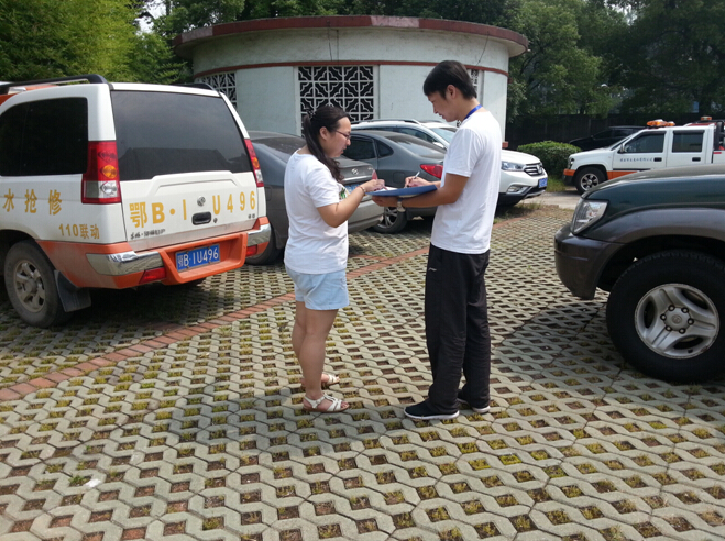 圖為:紀(jì)檢員在涼亭山水廠核對(duì)、查看車輛定點(diǎn)停放情況。