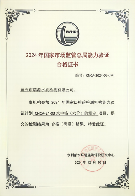 水質(zhì)檢驗(yàn)?zāi)芰︱?yàn)證是有效提高實(shí)驗(yàn)室能力的重要手段,近期生產(chǎn)運(yùn)行中心(瑞源水質(zhì)檢測(cè)公司)參加2024年國(guó)家級(jí)能力驗(yàn)證計(jì)劃“水中鉻(六價(jià))的測(cè)定”國(guó)家級(jí)能力驗(yàn)證項(xiàng)目,順利通過(guò)水利部水環(huán)境監(jiān)測(cè)評(píng)價(jià)研究中心考核,評(píng)價(jià)結(jié)果為合格(滿(mǎn)意)。