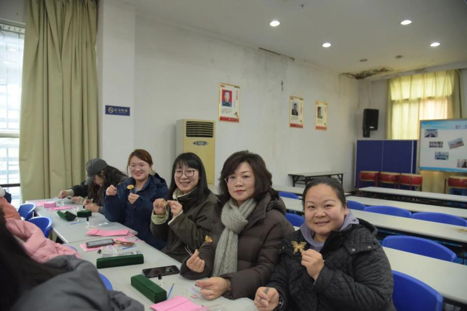 聽完講解后,女職工們迫不及待地開啟了創(chuàng)作之旅,只見她們將顏色各異的大片螺鈿搗碎,挑選心儀的螺鈿片,然后小心翼翼地用膠水將螺鈿片粘貼在胸針底托上。整個(gè)過程需要極大的耐心與細(xì)心,以及考驗(yàn)對(duì)色彩的搭配。大家不時(shí)的輕聲交流、相互分享經(jīng)驗(yàn),經(jīng)過一個(gè)多小時(shí)的努力,在一雙雙巧手的打造下,一枚枚精美的胸針便得以完美的呈現(xiàn)。