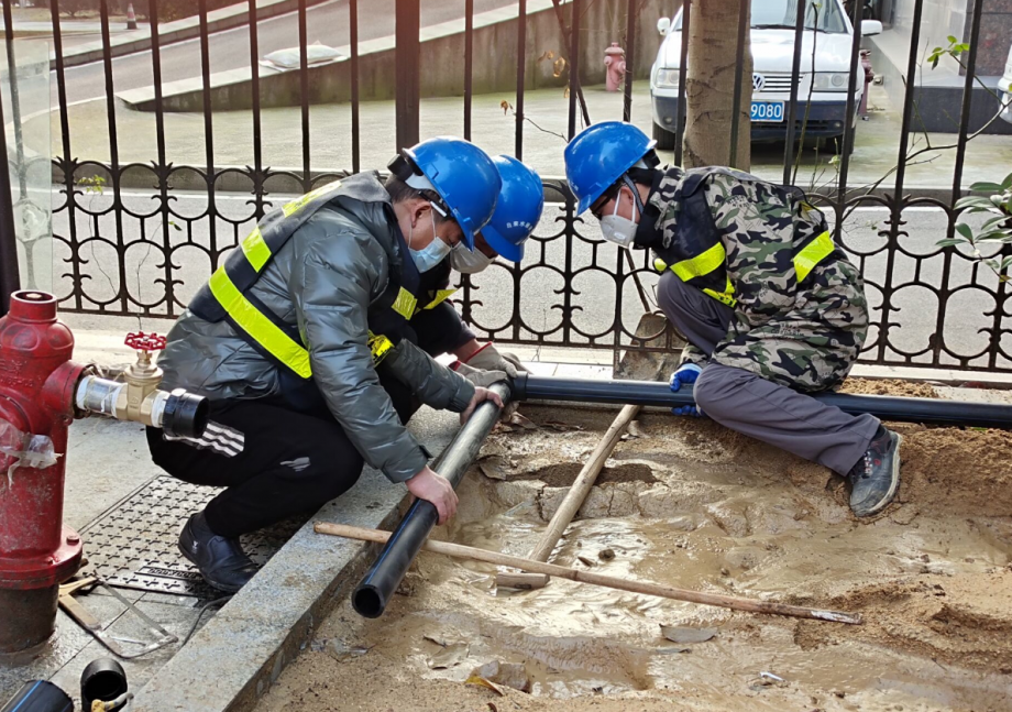 在抗擊疫情特殊時(shí)期,公司克服材料采購(gòu)、車輛調(diào)度、人員安排等困難,特事特辦,當(dāng)天便迅速安排公司客服中心、設(shè)計(jì)公司以及建設(shè)工程公司相關(guān)負(fù)責(zé)人趕赴現(xiàn)場(chǎng),進(jìn)行勘測(cè)設(shè)計(jì)、制定方案并組織材料施工,僅5小時(shí)便完成外部供水管道敷設(shè),具備了通水條件。