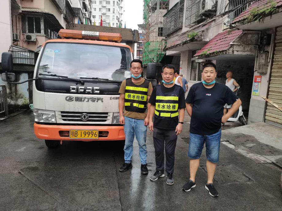 7月21日傍晚,黃石市自來水有限公司管網(wǎng)維護(hù)公司副經(jīng)理王煒(中)、管道工陳梨(左)、司機(jī)羅嘉喜(右)接到支援任務(wù)后,趕緊回家拿了幾件換洗衣服,就駕駛一輛載重5噸的應(yīng)急送水車出發(fā)了。