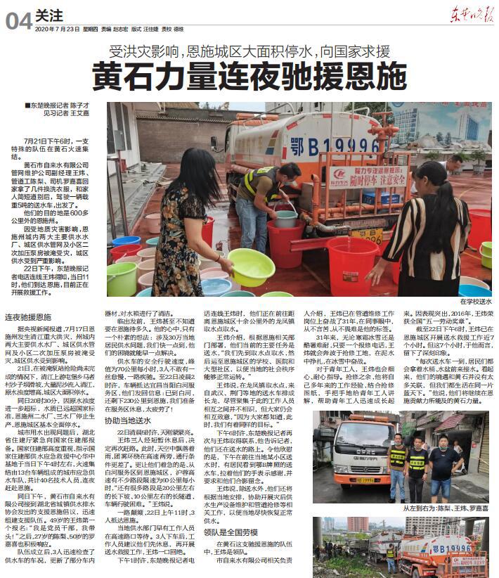 市自來水有限公司派專人支援恩施水司的舉動(dòng)得到了《東楚晚報(bào)》記者關(guān)注,并于7月23日作了《受洪災(zāi)影響,恩施城區(qū)大面積停水,向國(guó)家求援——黃石力量連夜馳援恩施》專題報(bào)道,引起廣泛關(guān)注和好評(píng)。